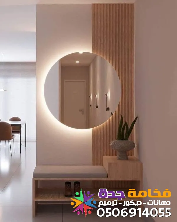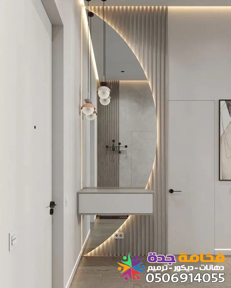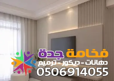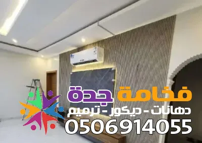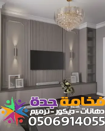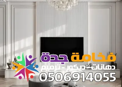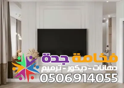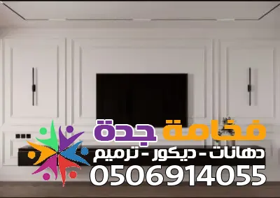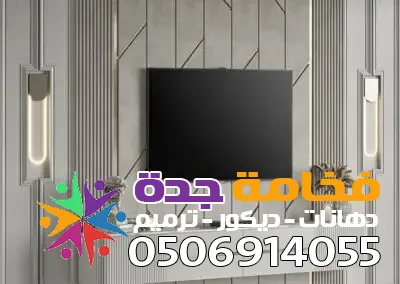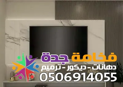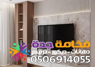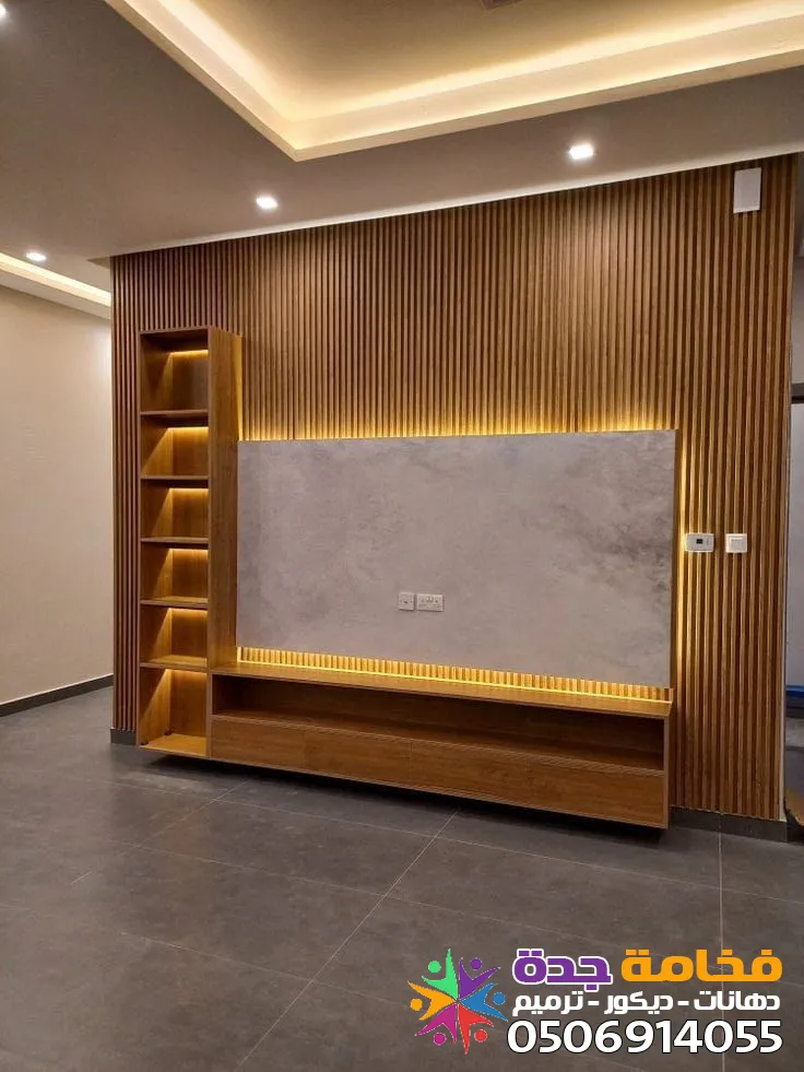 نصيحة مصمم: اجعل بديل الرخام في المنتصف خلف الشاشة مباشرة،ودهانات داخلية جدة👉وأحط الأطراف ببراويز من بديل الخشب لإعطاء عمق للمكان.